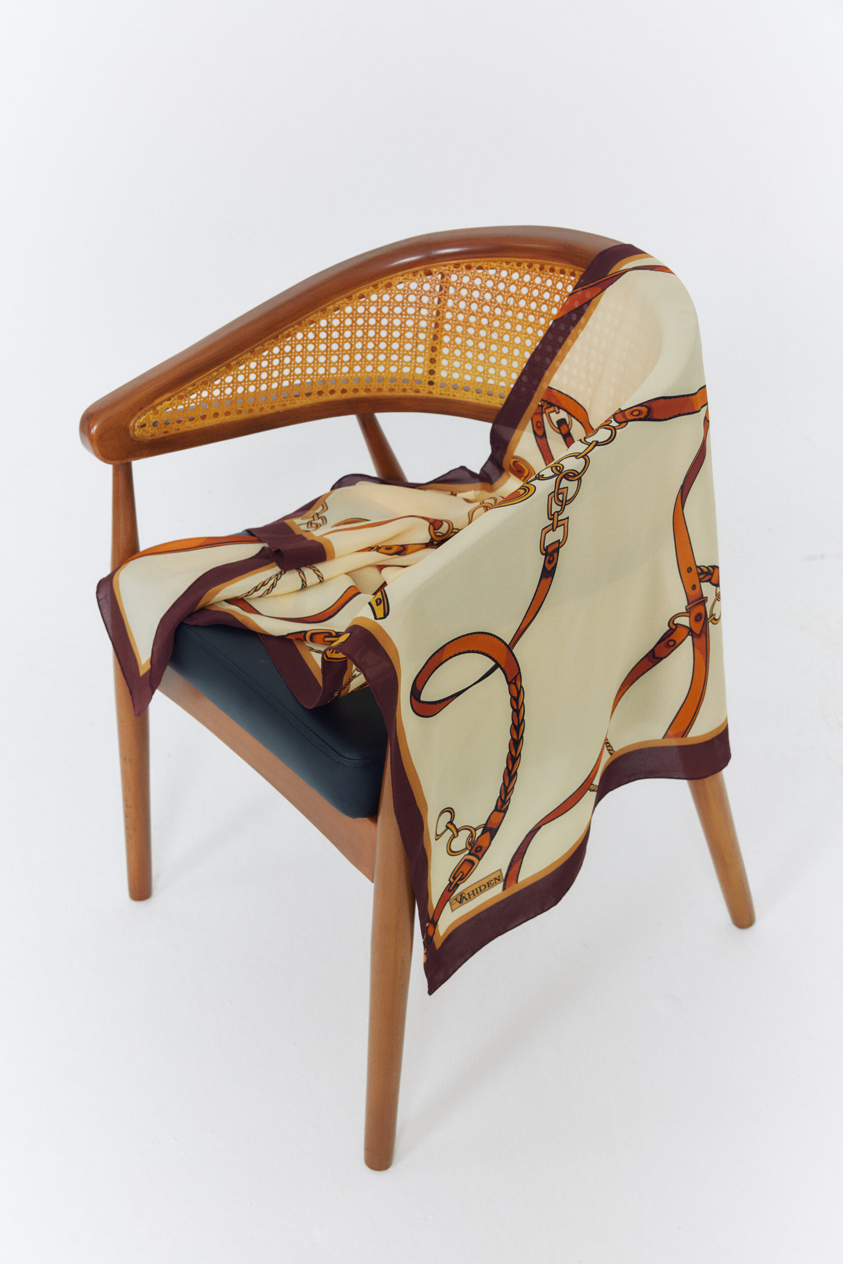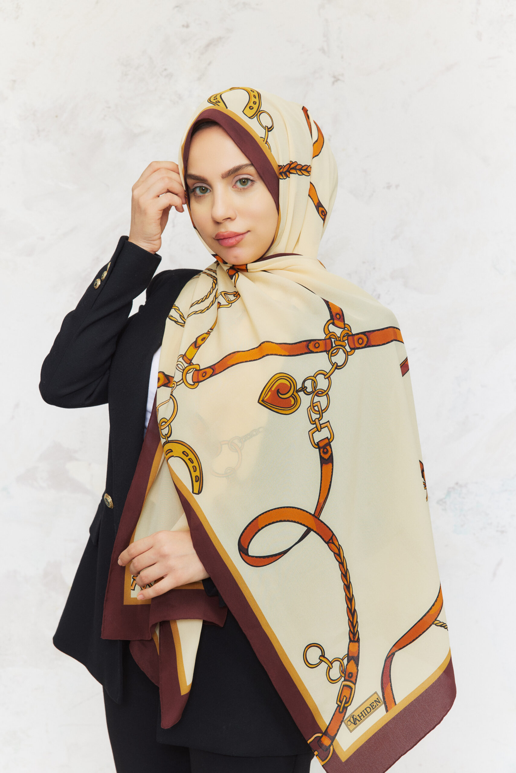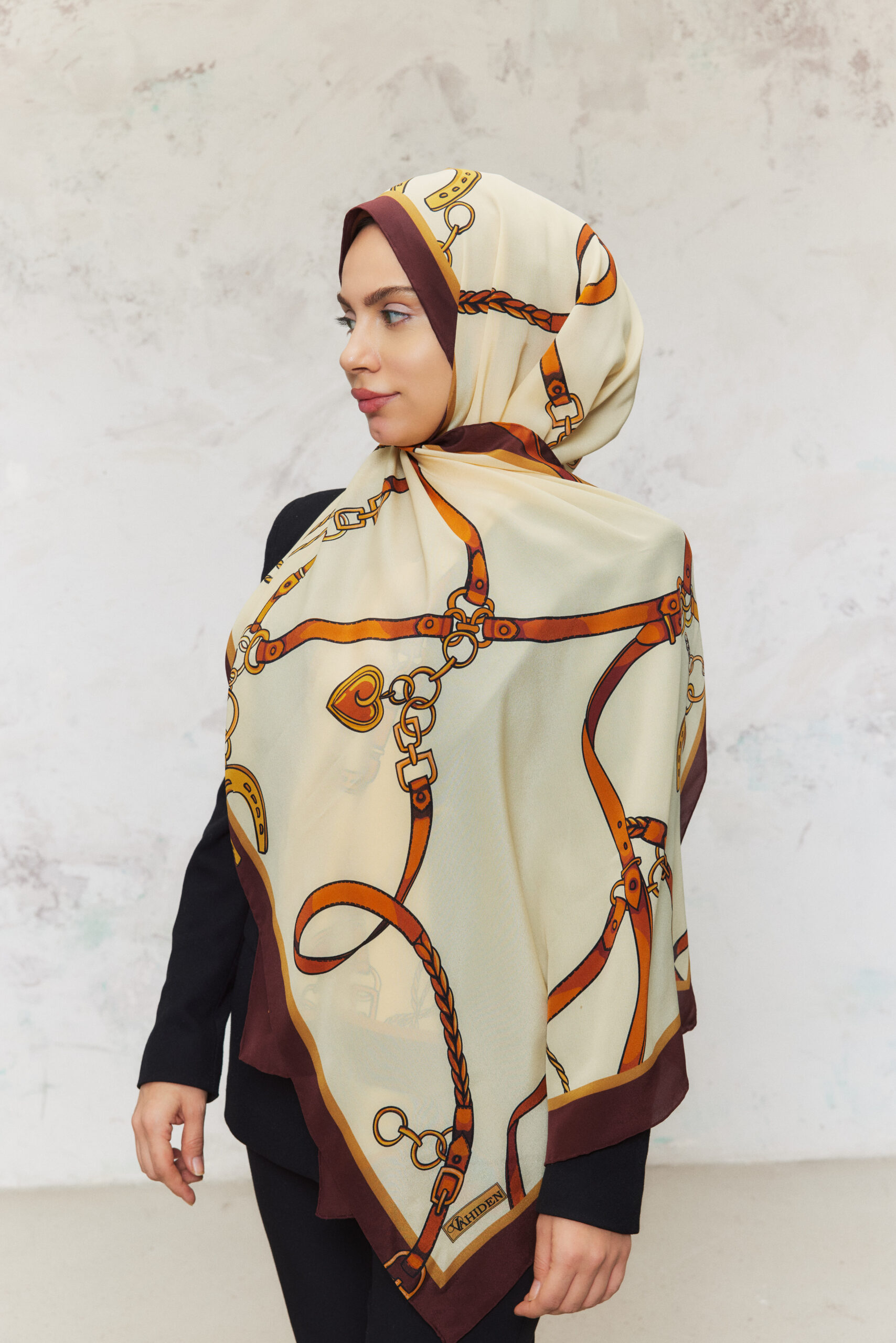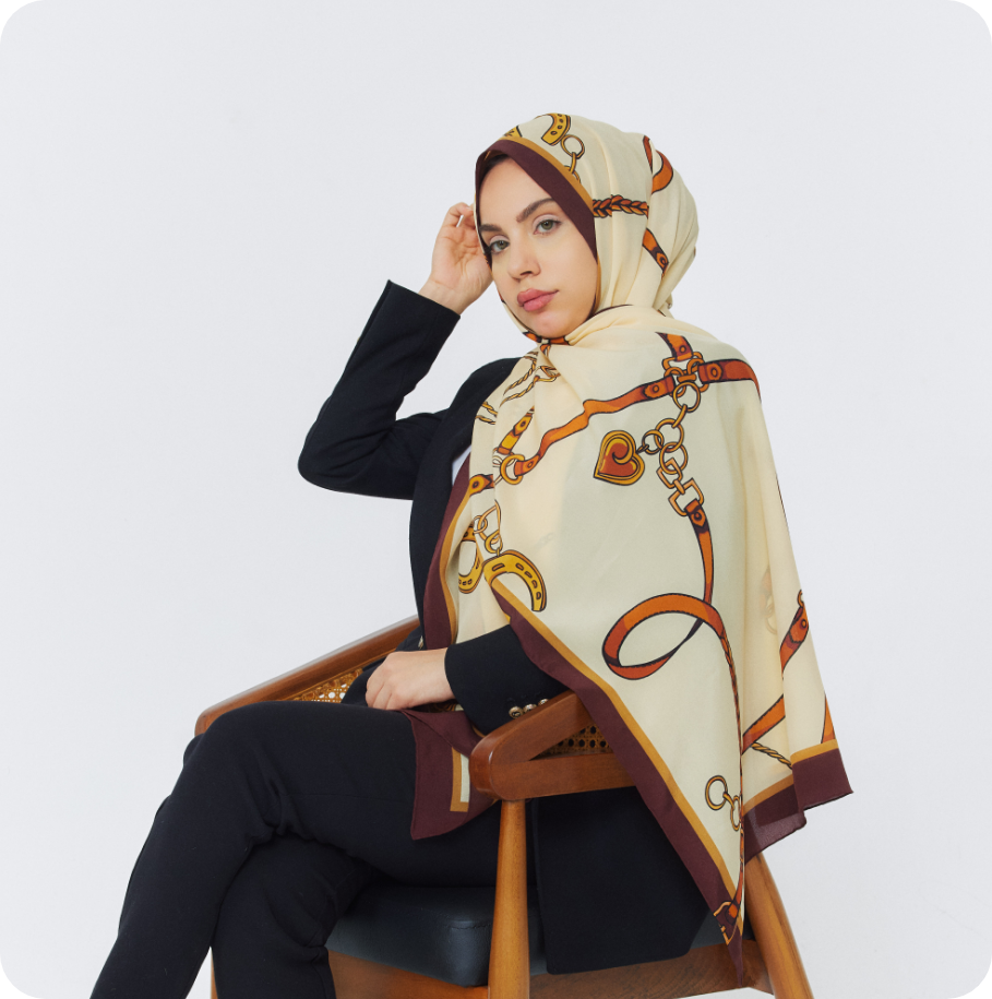 Ortadoğunun kervan yollarından ve taş şehirlerinden ilham alan Revan, altın tonlu kayışlar, zincirler ve şans nallarıyla yolculuk hissini ipek üzerinde yeniden yorumluyor. Krem zemin üzerinde akıp giden sıcak sarı ve tarçın tonları, bordo çerçeveyle buluşarak her bağlama şeklinde hareketli ama son derece sofistike bir görünüm sunuyor.